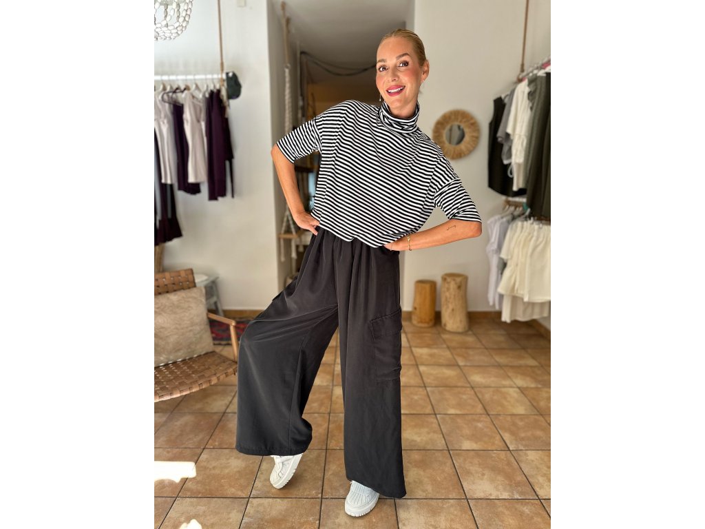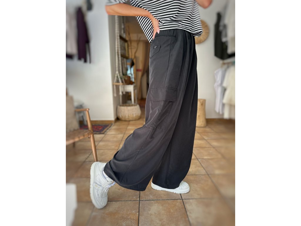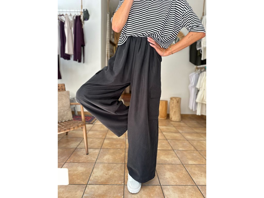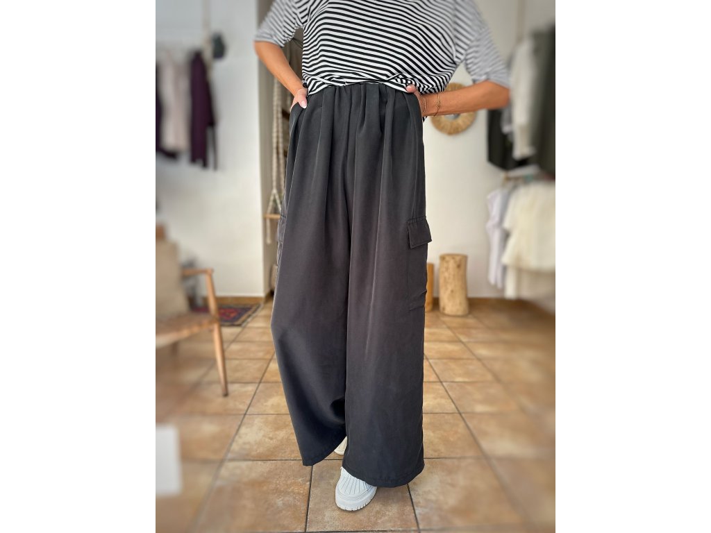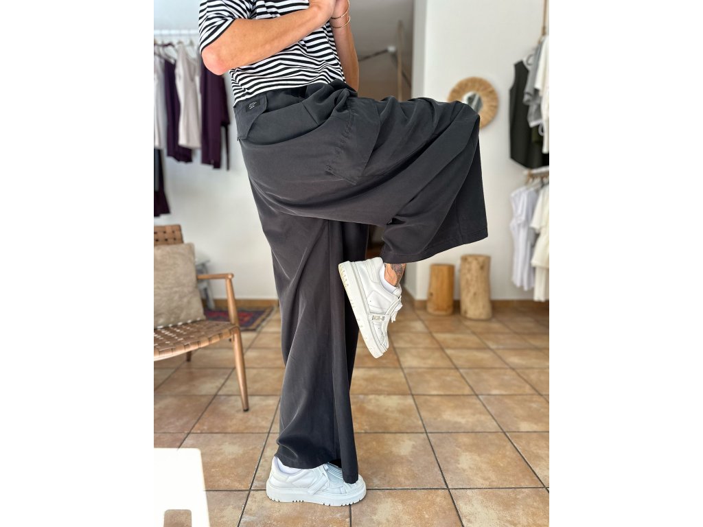 Kalhoty, které si Rézinky zamilovaly ještě dřív, než jsme je stihly pořádně pověsit na ramínko. Nový střih, který sedne jak do pasu, tak na boky (vaše volba). Skrytá guma, jemné řasení, kapsa na stehně – pro lehkost, šmrnc i praktickou duši. Materiál? ( přírodní, nesmrtelný MODAL) Splývá, lichotí a nepustí. Celoroční kousek v elegantním antracitu.