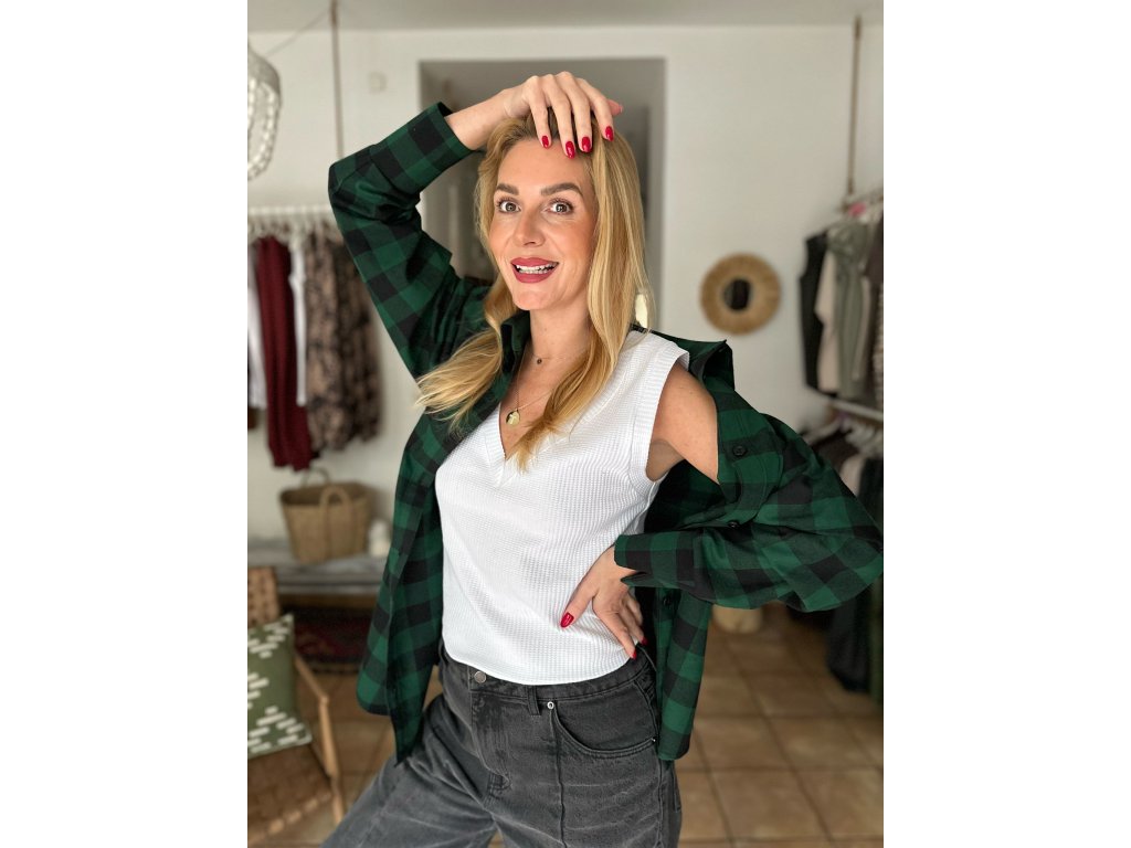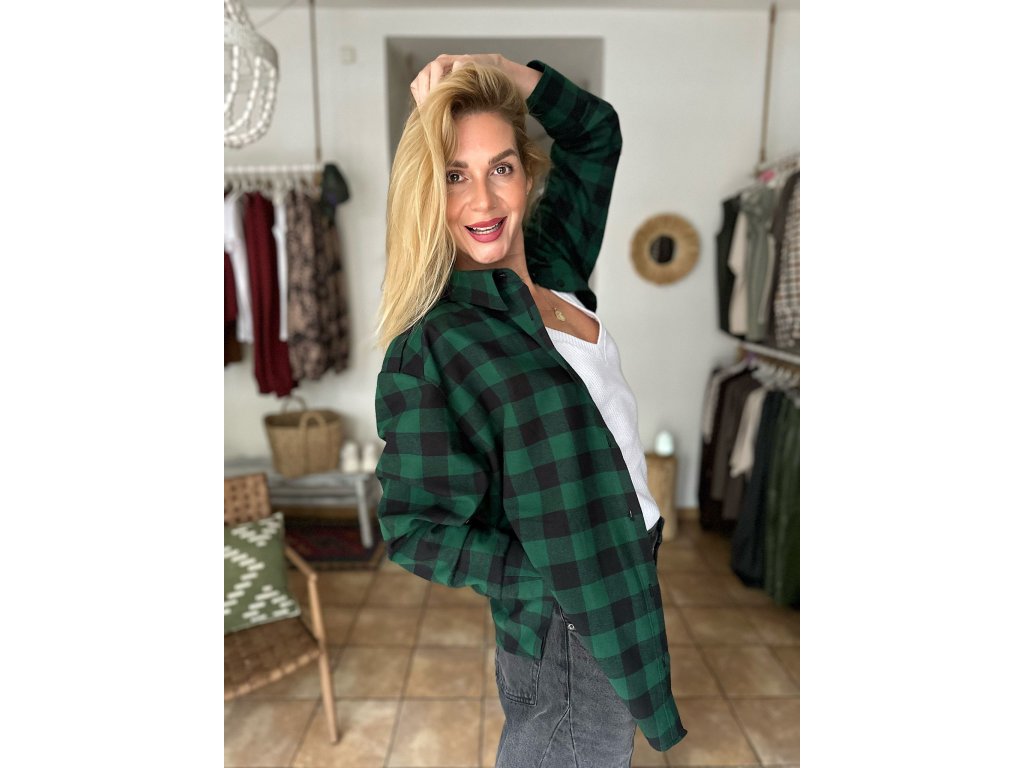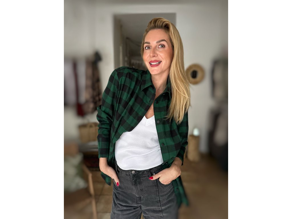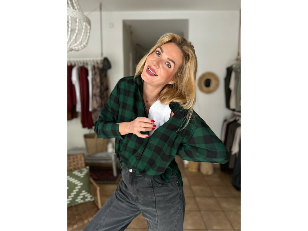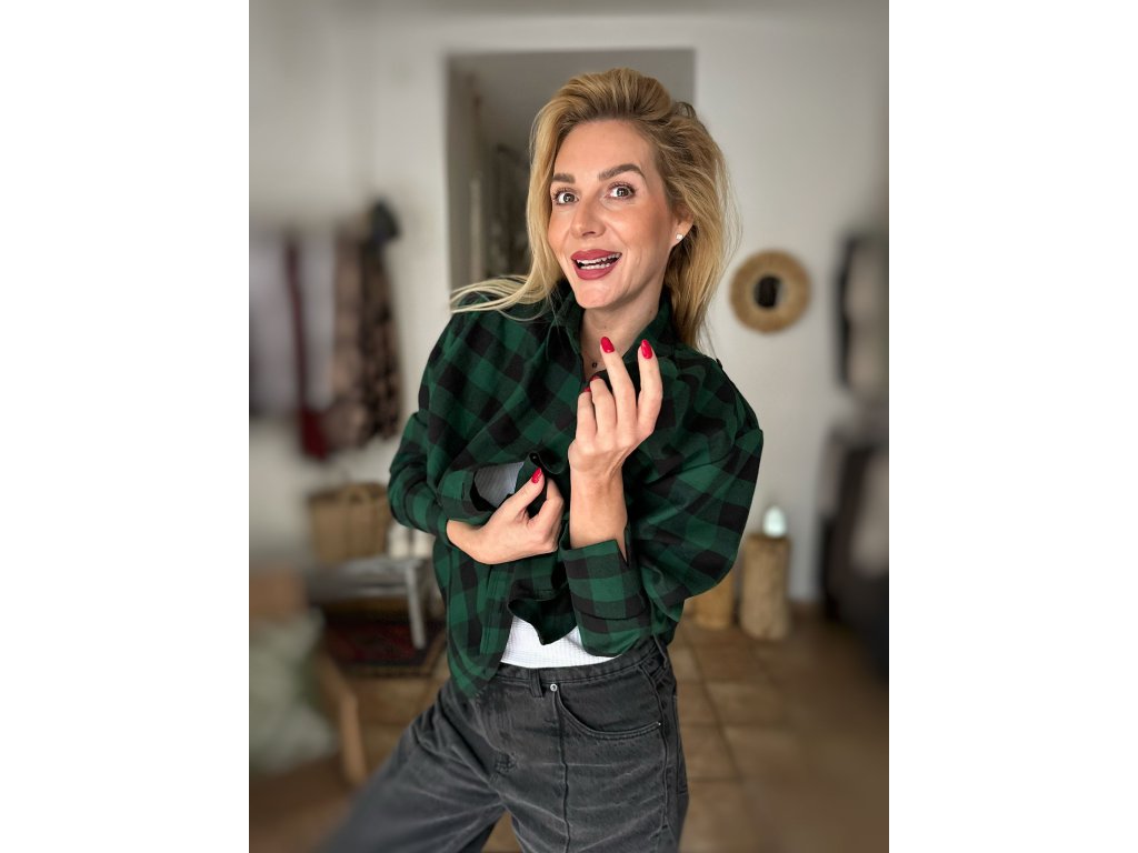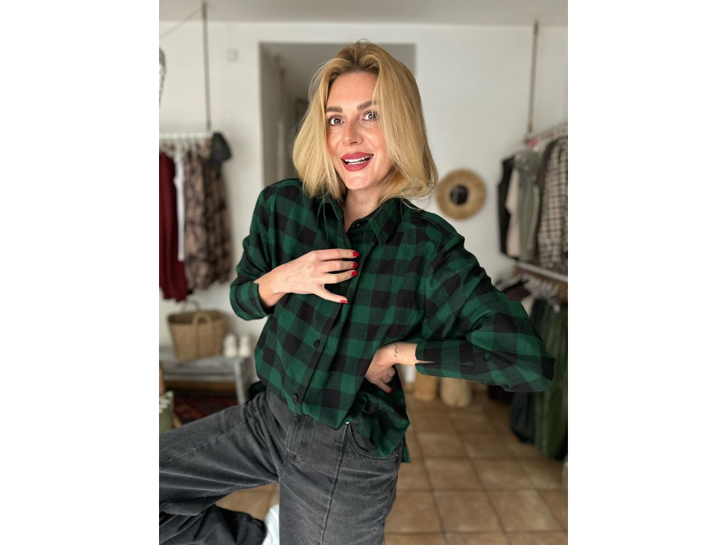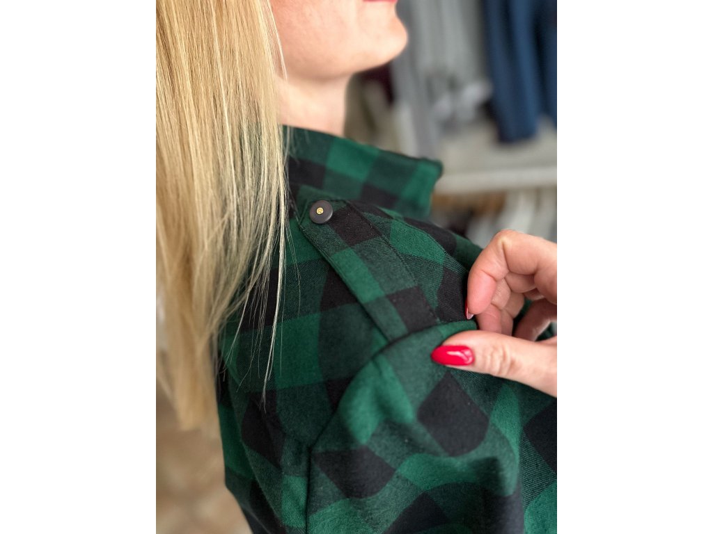 Boyfriendovej střih – ale takovej ten “půjčila jsem si od něj košili, ale pořád v ní vypadám líp než on”. Splývají jak cukroví v troubě po pěti minutách, flanelka je příjemná, měkká, no prostě zimní pohlazení.. A detaily? Vyhrály jsme si. Epolety (ano, frčky – protože Re.Za se nebojí být generál elegance), na nich krásnej knoflíček, knoflíkový dírky jak vyladěný linecký.. a ta kostka! Lahvově zelenočerná – tak tmavá a noblesní, že by mohla viset na vánočním stromku jako ozdoba.