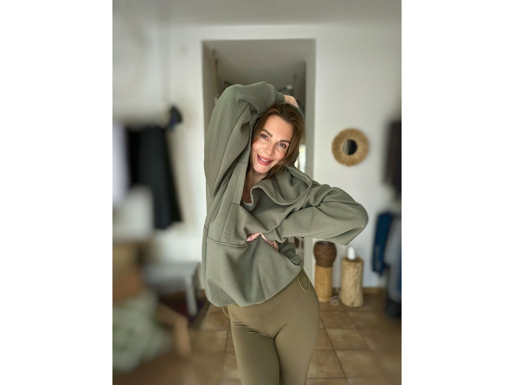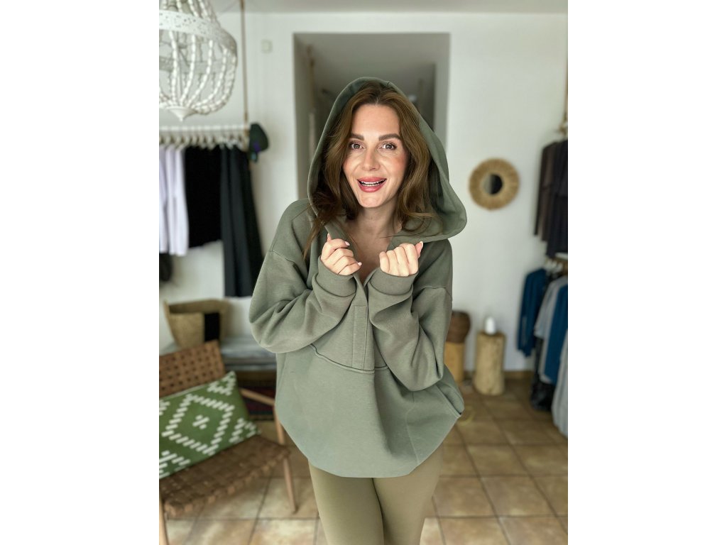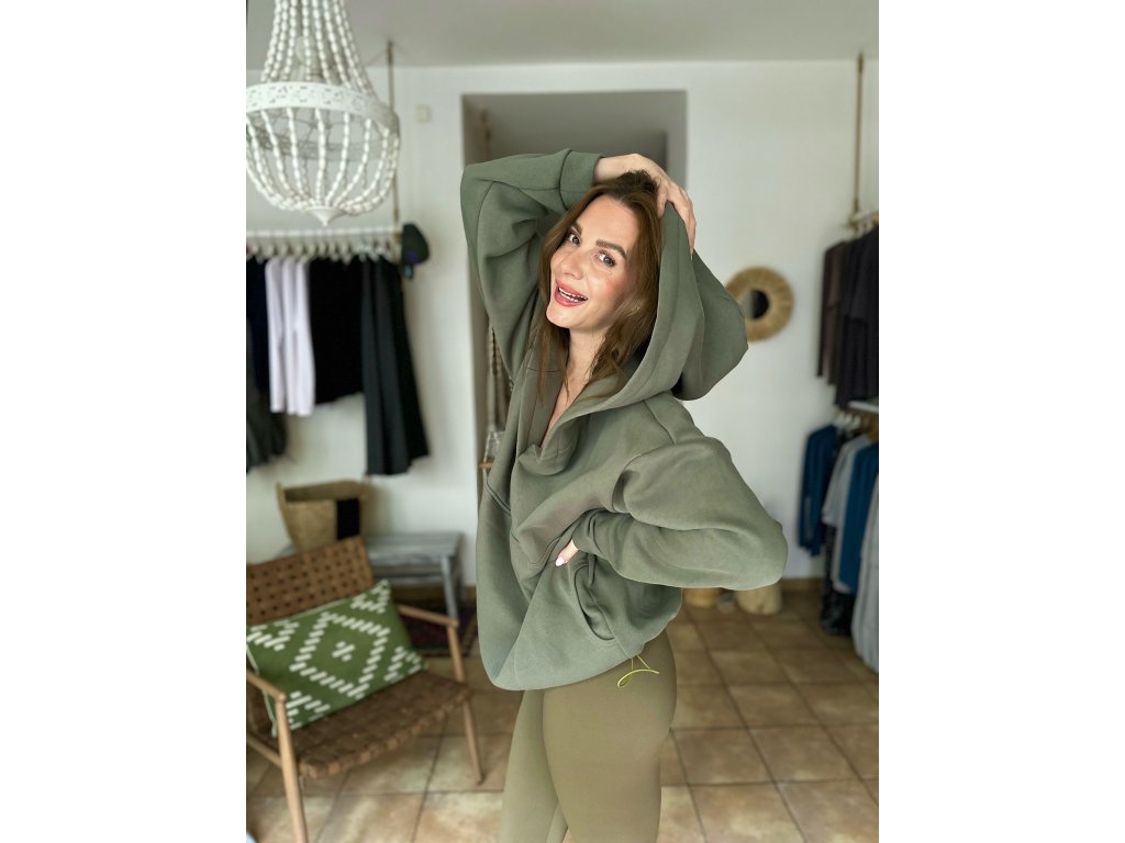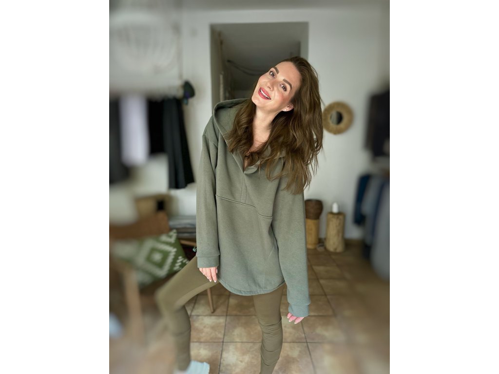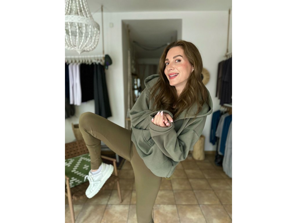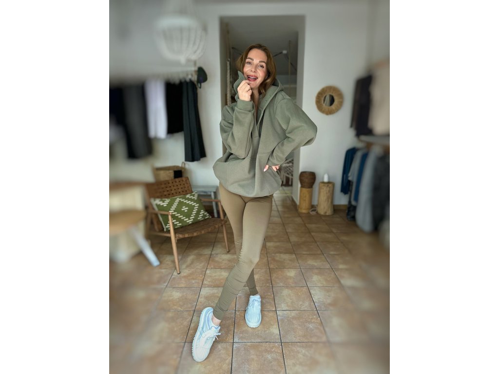 Jiný odstín khaki, promakaný střih, dole gumičky na stahování: