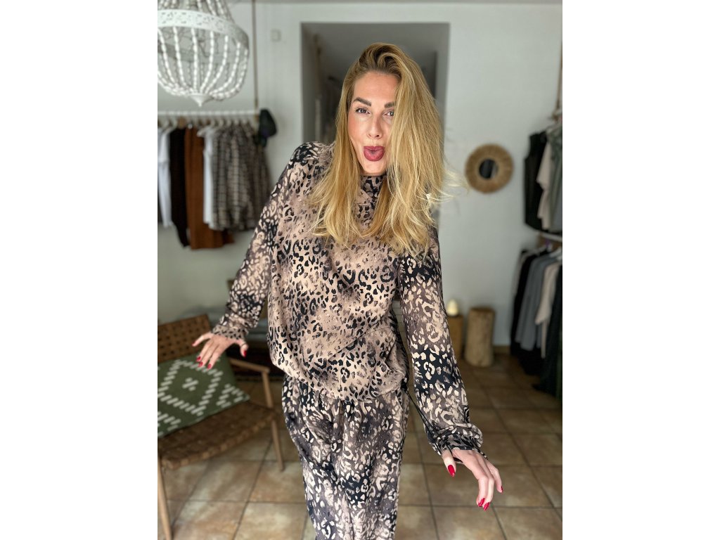 Leopard není trend. Leopard je životní styl. A tenhle materiál je lehký, splývavý a tak nesmrtelný, že kdyby měl rodný list, má na něm napsáno „trvalá hodnota“. Mikina má po stranách gumičky, takže ji můžete nosit rovně jako classy queen, nebo stáhnout a vytvořit z ní krásnou crop verzi.