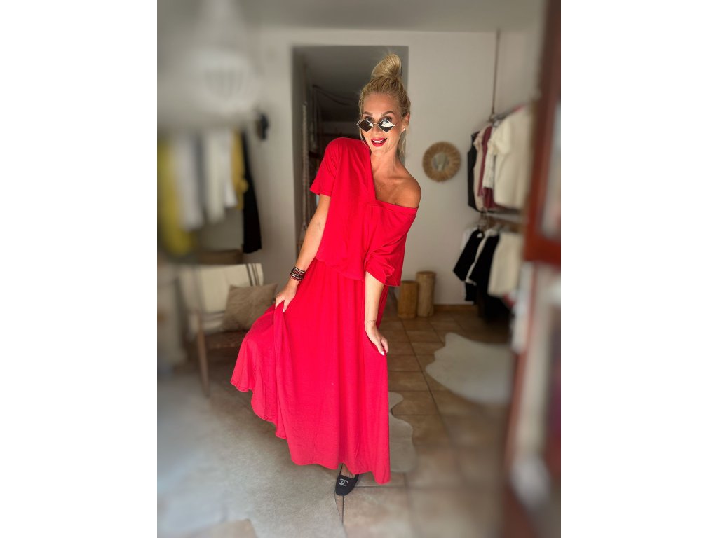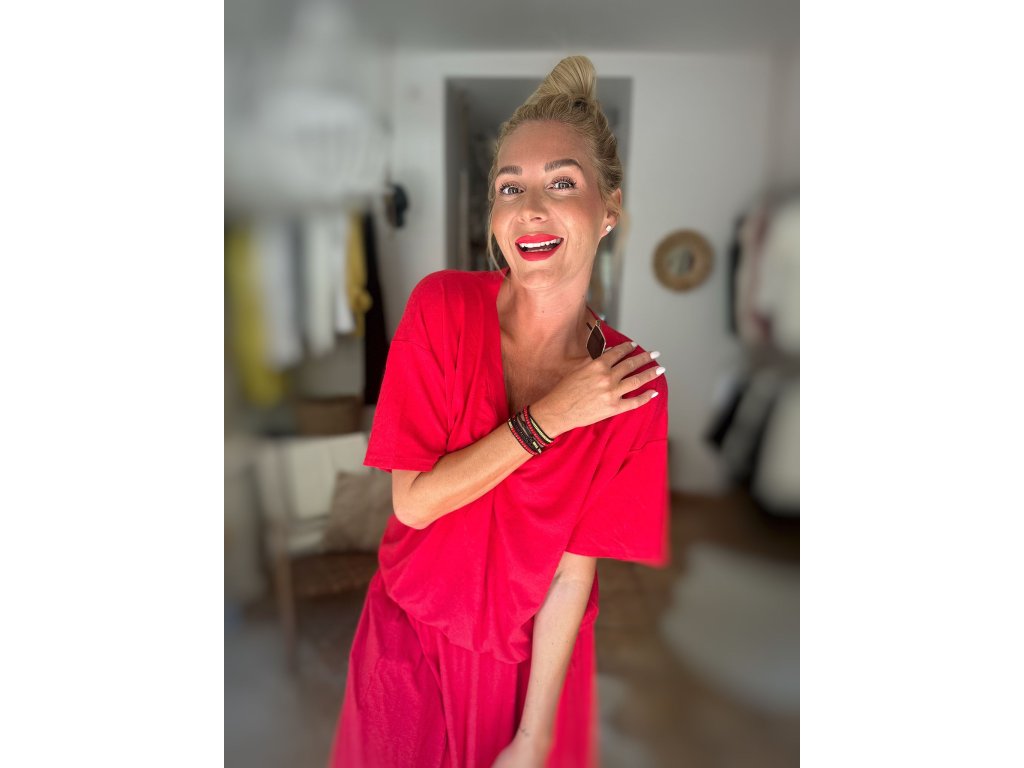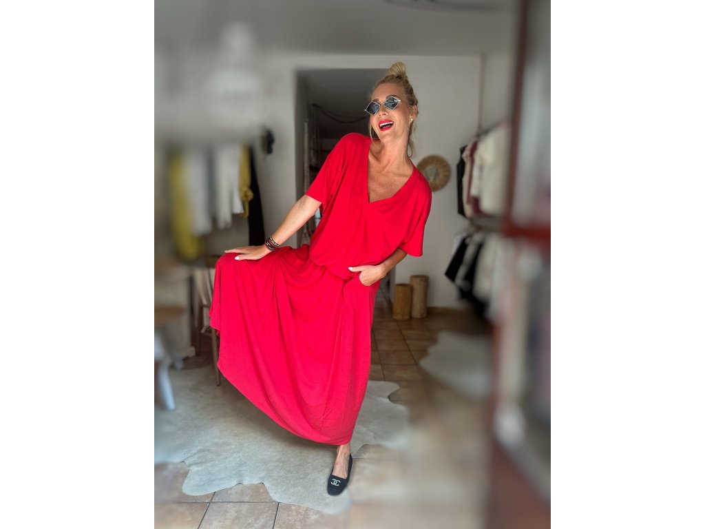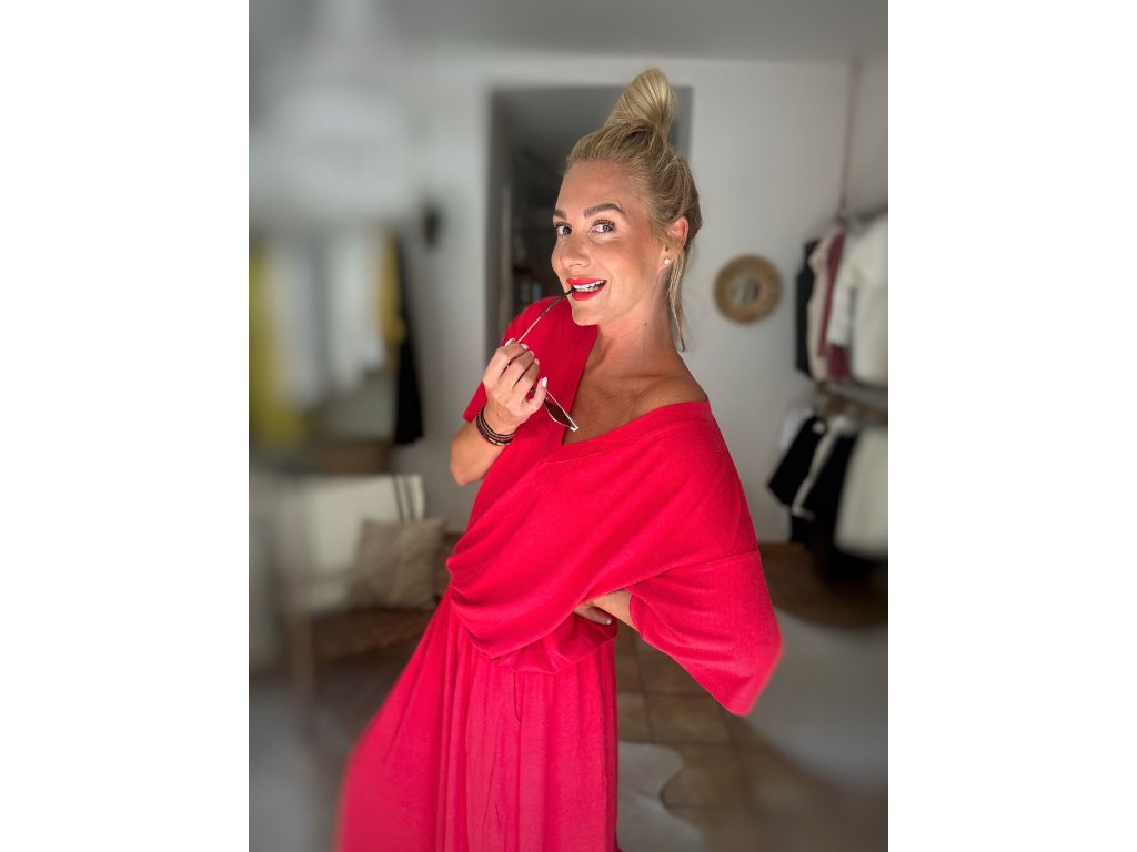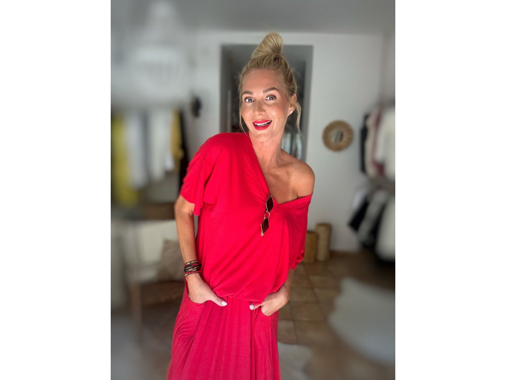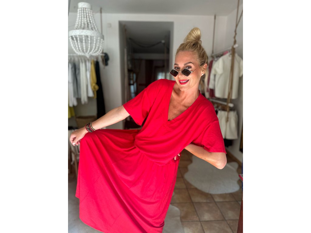 Rudé šaty v novém střihu, který si zamilujete. Vršek se nese v našem BOYFRIEND střihu a sukně je lehce rozšířená do áčka. Příjemná guma v pase se přizpůsobí všem postavám - ať už jste hubenější gazela, nebo máte prostě ráda, když se můžete nadechnout. Materiál je krásně pružný.