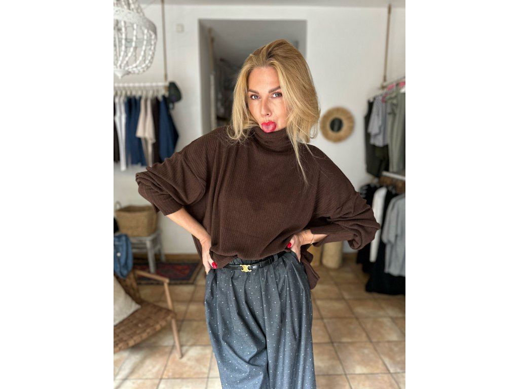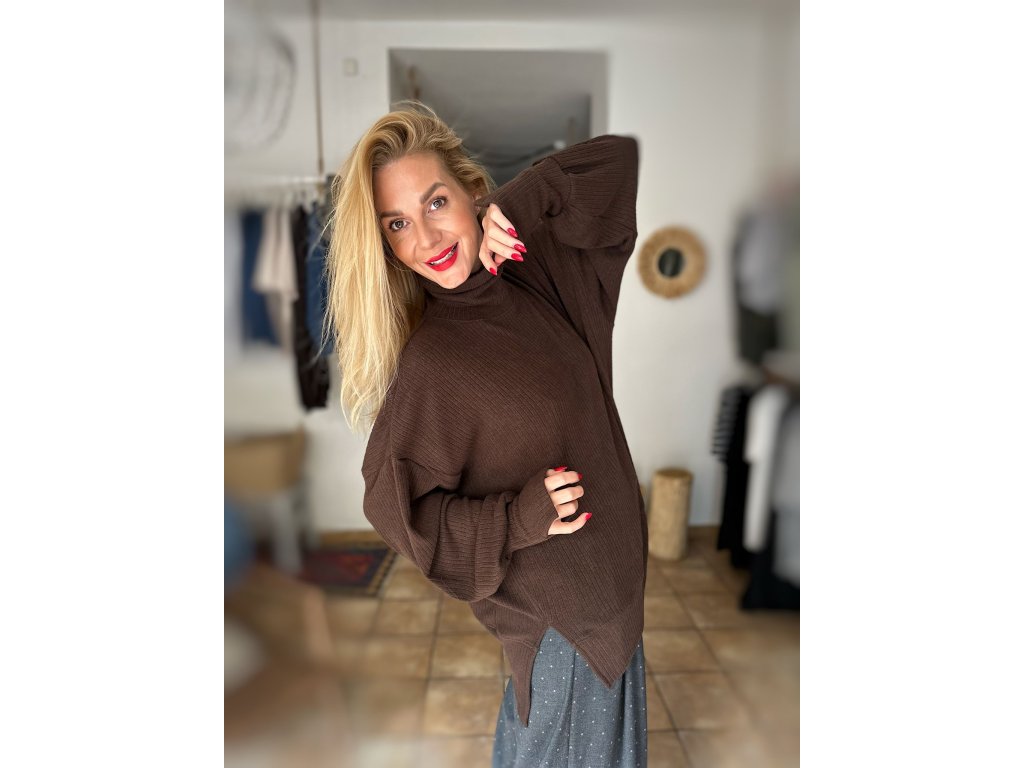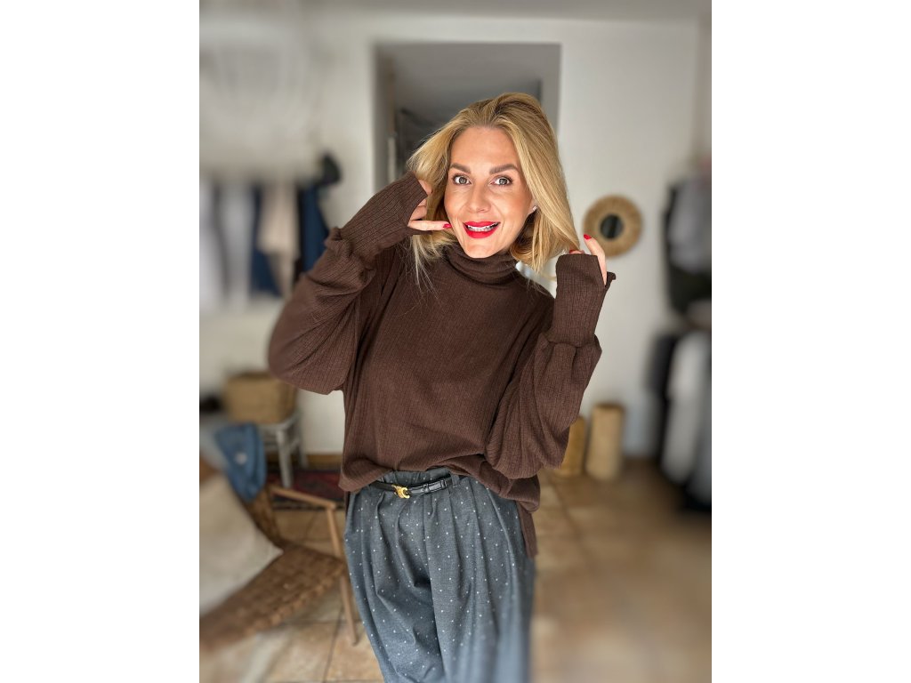 Rolákový svetr – známý střih, ale pořád nás baví. Volný, měkký, jemný jako vánek, v odstínu čokoládově hnědé, která sluší všem ženám i náladám.
