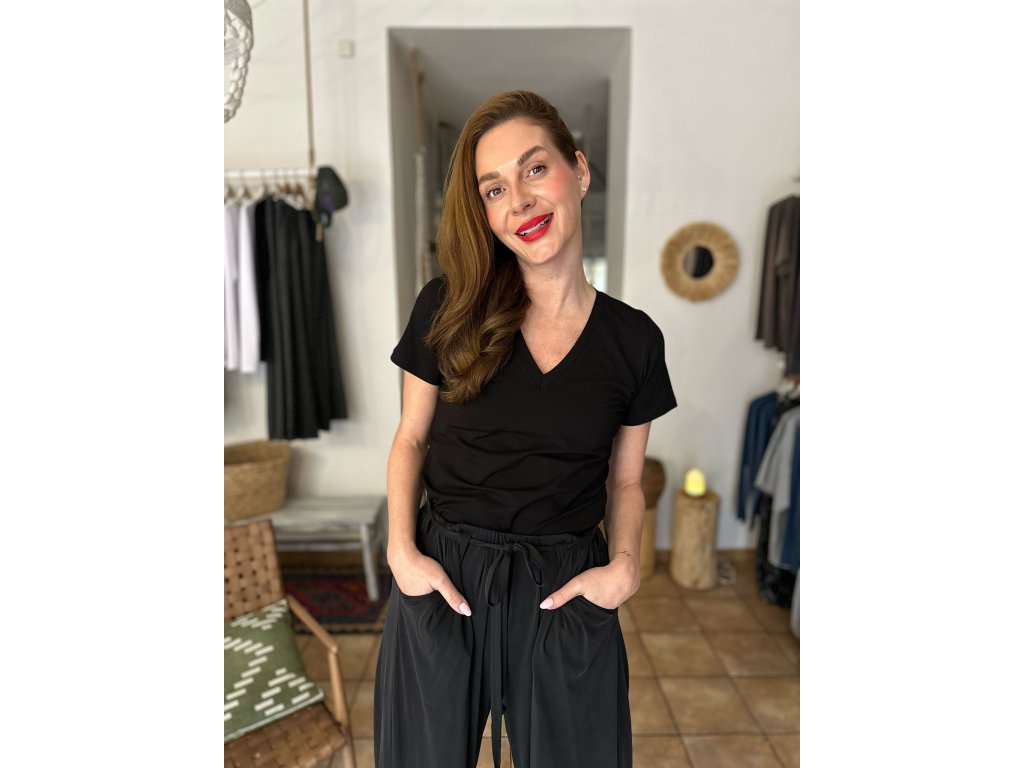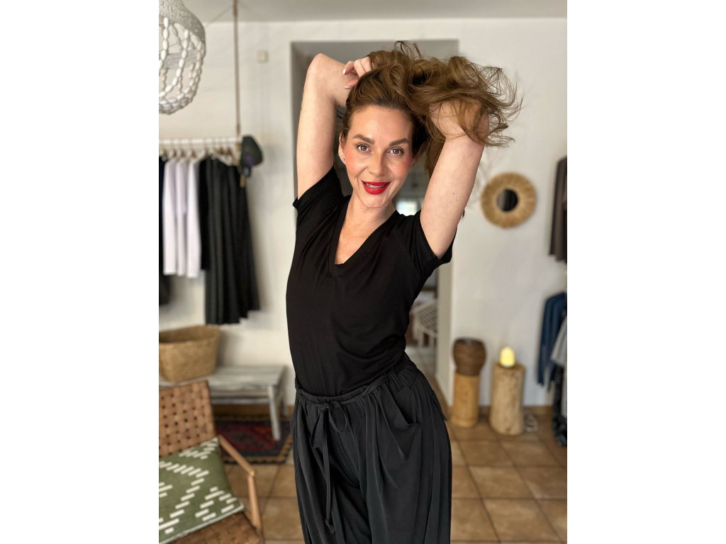 Viskózové, lehce upnuté tričko. Krásně kopíruje postavu a dělá to, co má dobrý tričko dělat: