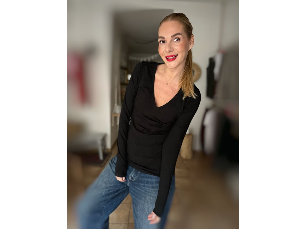 Upnuté černé triko s dlouhým rukávem s véčkovým výstřihem.