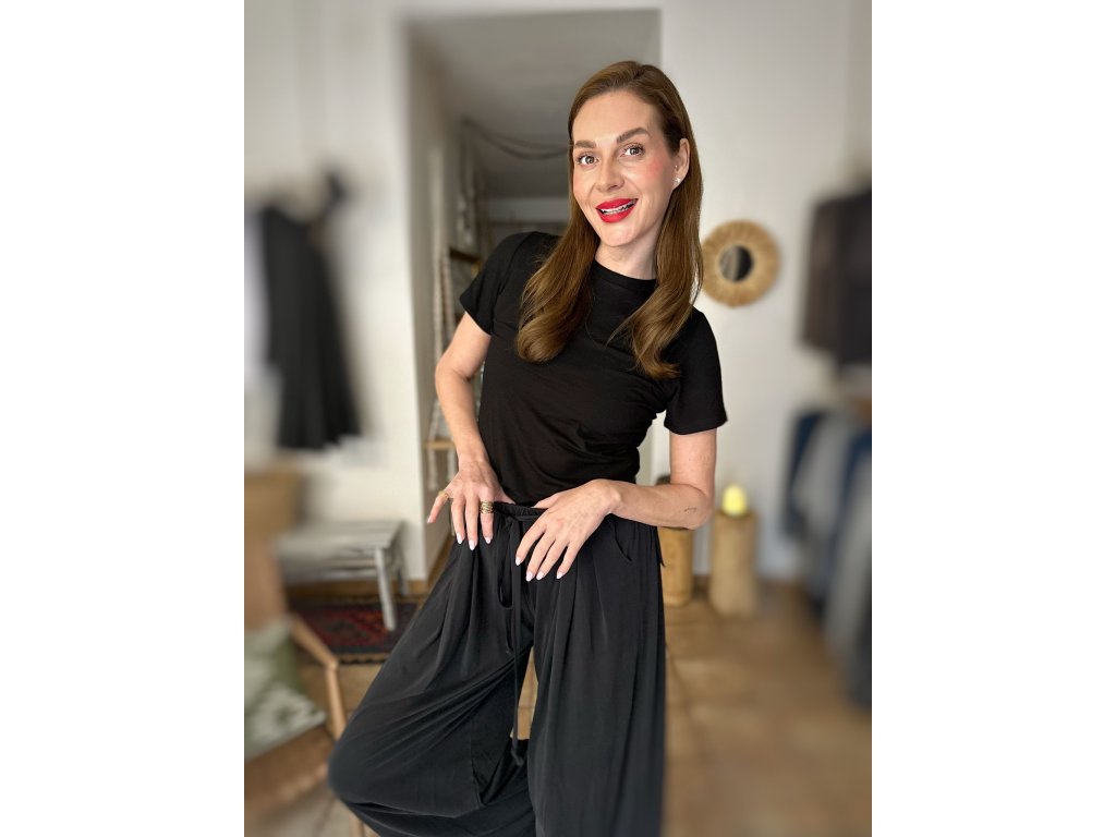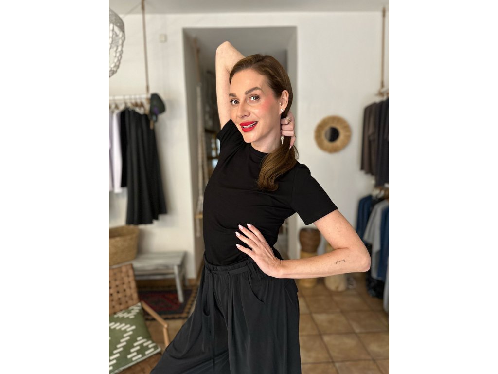 Viskózové, lehce upnuté tričko. Krásně kopíruje postavu a dělá to, co má dobrý tričko dělat: