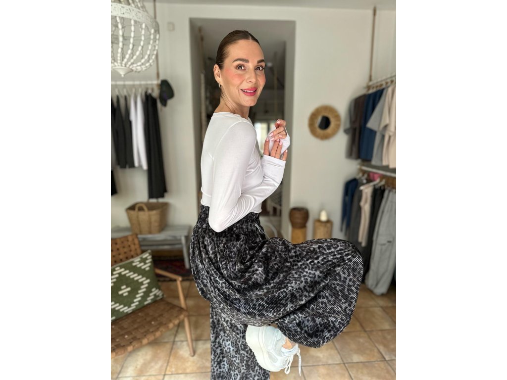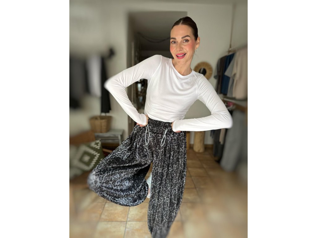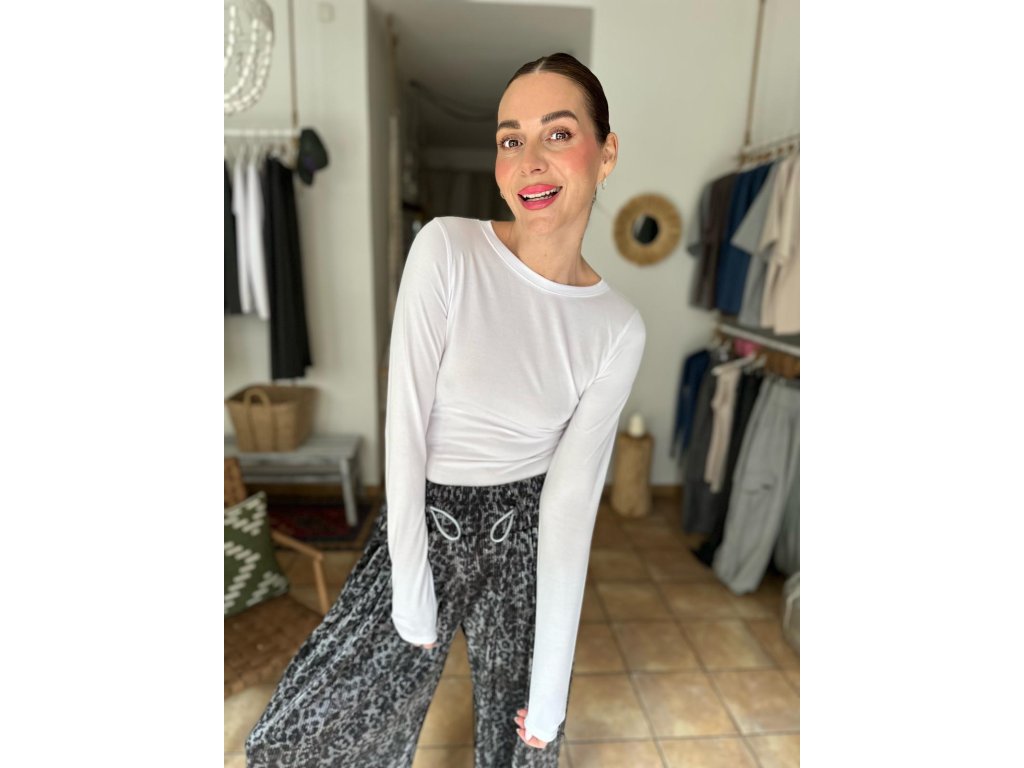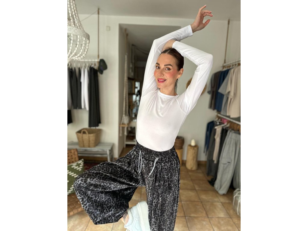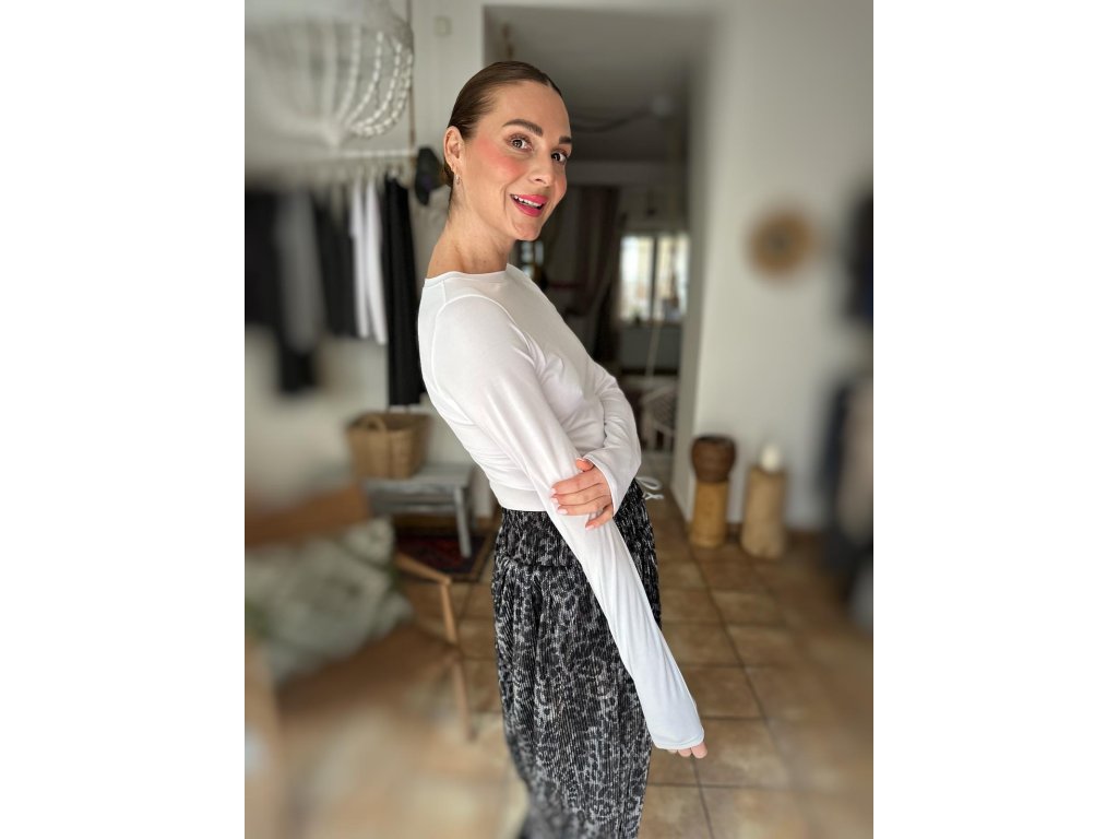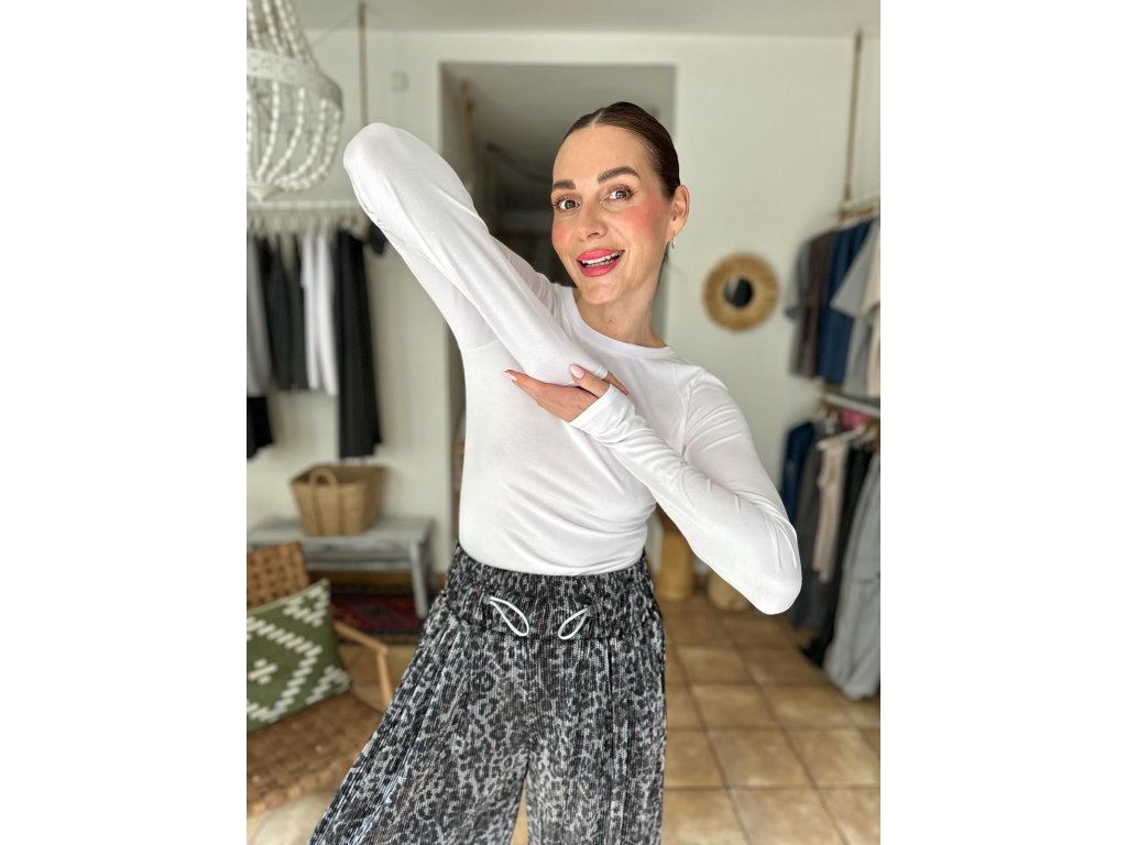 Nově z modalu, kulatý výstřih, extra dlouhé rukávy (ano, přesně ty, co chceš pořád trochu shrnutý). Materiál jemný, lehce sexy, tak akorát průsvitný, že podprsenka neruší, ale ani nezmizíš….😉